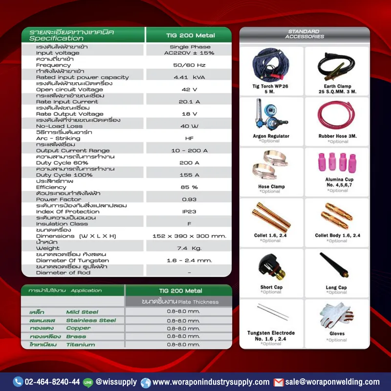 “เครื่องเชื่อม TIG 200 Metal LONGWELL ระบบอินเวอร์เตอร์ DC กระแสไฟสูงสุด 200A ถูกออกแบบมาเพื่อการเชื่อมโลหะคุณภาพสูง เช่น สแตนเลส เหล็ก ทองแดง และไทเทเนียม มาพร้อม 100% Duty Cycle ที่ 155A เชื่อมต่อเนื่องได้ยาวนาน และ ได้รับฉลากประหยัดพลังงานเบอร์ 5”