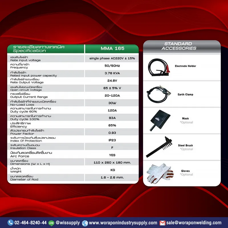 - กระแสไฟเชื่อม 165 แอมป์: เพียงพอสำหรับงานเชื่อมเหล็กทั่วไป และงานซ่อมแซมที่ไม่ต้องใช้กระแสไฟสูงมาก