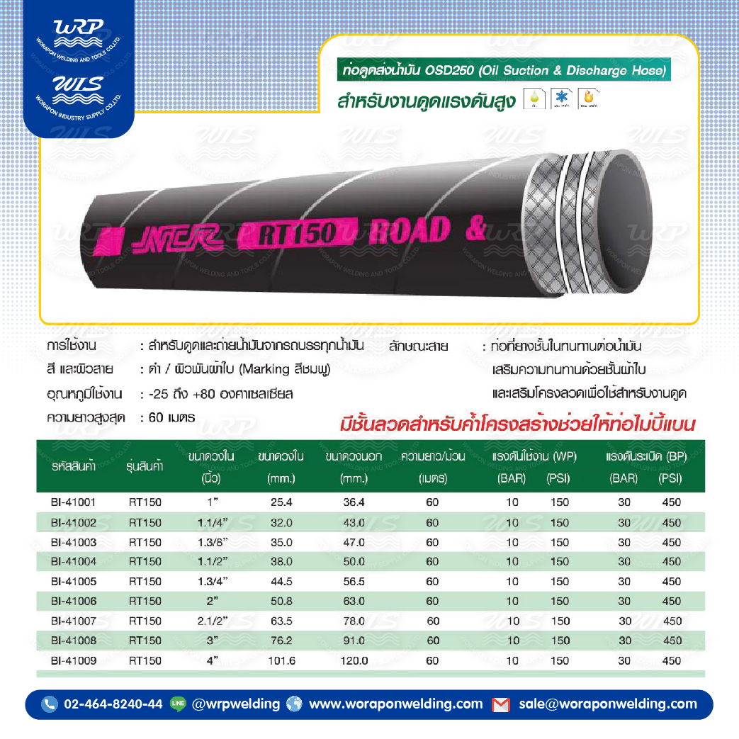 - ท่อที่ยางชั้นในทนนทานต่อน้ำมันเสริมความทนทานด้วยชั้นผ้าใบเเละเสริมโครงลวดเพื้อใช้สำหรับงานดูด