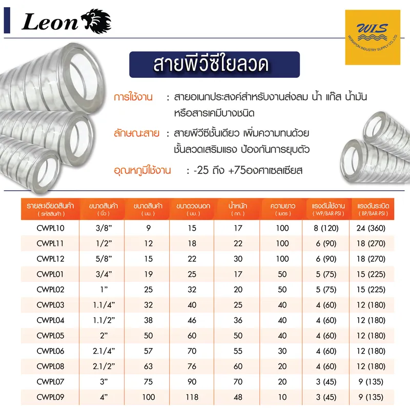 สาย PVC มีลวด Leon (PVC Spring Hose) เป็นสายส่ง/ดูดอเนกประสงค์แบบชั้นเดียว ผลิตจาก PVC คุณภาพดี สีใส เสริมความแข็งแรงด้วยโครงลวดเหล็กฝังภายในตลอดเส้น ป้องกันการยุบตัวหรือแฟบเมื่อใช้ในงานดูด (Vacuum) และทนทานต่อแรงดันในการส่งของเหลว เหมาะสำหรับการใช้งานหนักในโรงงานอุตสาหกรรมและงานเกษตรกรรมที่ต้องดูด-ส่งของเหลวหลากหลายชนิด รวมถึงน้ำมันและสารเคมีบางประเภท