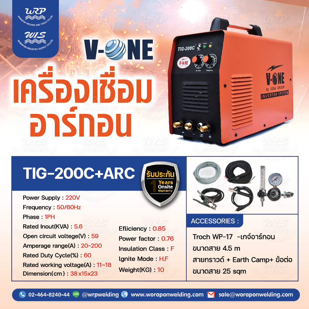 เครื่องเชื่อมอาร์กอน+ไฟฟ้า V-ONE รุ่น TIG-200 (TIG+ARC) 2 ระบบ