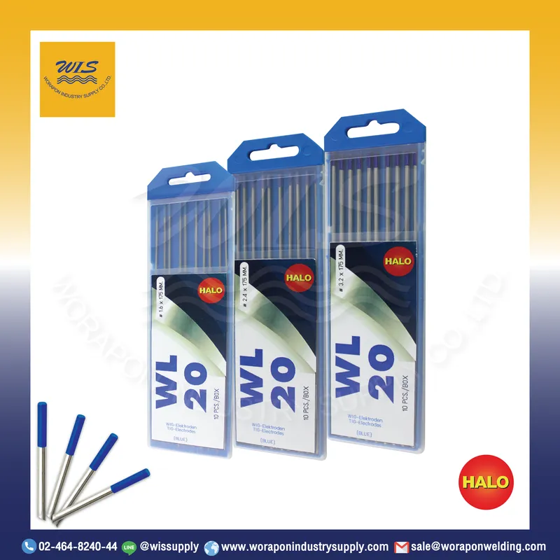 ลวดเชื่อมทังสเตน HALO (ฟ้า) – ได้รวมเอาข้อดีของทังสเตนสีแดงและทังสเตนสีเขียวไว้ด้วยกัน ให้การอาร์กเริ่มต้นได้ดี อาร์กนิ้ม สม่ำเสมอ ,ไม่แผ่รังสี มีอายุการใช้งานยาวนานกว่าสีแดงถึง 2%